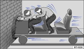 Fahrzeuginsassen, die ihre Sicherheitsgurte nicht angelegt haben, sind also nicht mit ihrem Fahrzeug verbunden. Bei einem Frontalunfall werden sich diese Personen folglich mit der gleichen Geschwindigkeit weiterbewegen, wie sich das Fahrzeug vor dem Aufprall bewegt hat, bis sie etwas aufhält! Da die Fahrzeuginsassen in unserem Beispiel keine Sicherheitsgurte tragen, wird im Falle eines Aufpralls die gesamte Bewegungsenergie der Fahrzeuginsassen nur durch den Aufprall an die Mauer abgebaut → Abb. 77 .