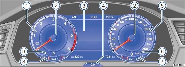 Über den Menüpunkt Ansichten des Volkswagen Informationssystems → Volkswagen Informationssystem können verschiedene themenspezifische Informationsprofile ausgewählt werden. Je nach gewähltem Informationsprofil zeigt das Active Info Display zusätzliche Informationen in der Mitte der Rundinstrumente → Abb. 17 ② an. Folgende Informationsprofile sind wählbar: