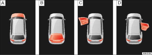 Nach dem Entriegeln des Fahrzeugs und während der Fahrt werden im Display des Kombi-Instruments geöffnete Türen sowie eine geöffnete Motorraum- oder Heckklappe dargestellt und ggf. auch akustisch signalisiert. Je nach Ausführung des Kombi-Instruments kann die Darstellung variieren.