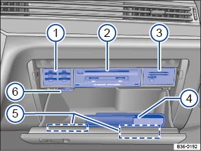 Im oberen Teil und im Deckel des Ablagefachs können sich Halter für Speicherkarten, Plastikkarten, Münzen und eine Aufnahme für ein Brillenfach befinden → Abb. 151 ① ③ ⑤ .