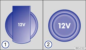 Abb. 161 Aufklappbare 12-Volt-Steckdose ①, 12-Volt-Steckdose mit herausziehbarer Abdeckung ②.