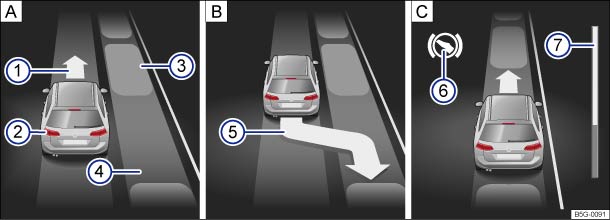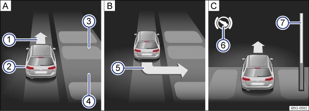 | Nur wenn die Aufforderung zum Einparken ⑤ im Display des Kombi-Instruments angezeigt wird, wurde die Parklücke bzw. die Parkbox als geeignet erkannt. | |