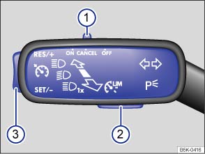 | GRA einschalten. | Schalter ① im Blinklichthebel in Stellung