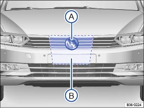 Abb. 211 Im Kühlergrill hinter dem Volkswagen Emblem: Radarsensor Ⓐ und freizuhaltender Bereich um den Radarsensor Ⓑ.