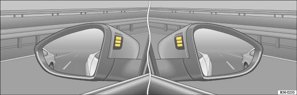 In dem Gehäuse des jeweiligen Außenspiegels informieren die optischen Anzeigen → Abb. 224 über den rückwärtigen Verkehr links und rechts des eigenen Fahrzeugs, wenn bei einem Spurwechsel Situationen als kritisch eingestuft werden.