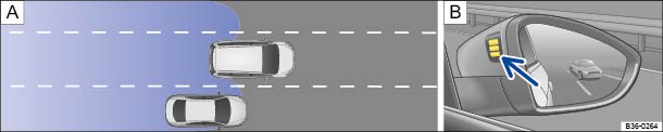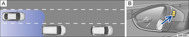 Abb. 226 Fahrsituation beim Überholen mit rückwärtigem Verkehr. Optische Anzeige im linken Außenspiegel.