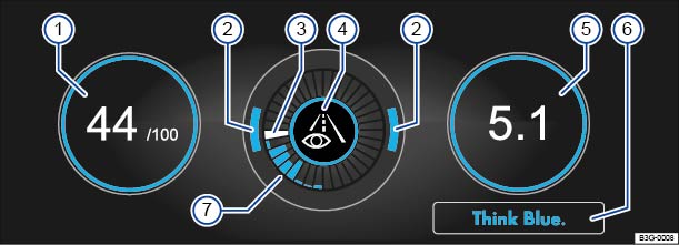 | ⑦ | Die blauen Segmente im mittleren Ring symbolisieren die Effizienz des Fahrverhaltens. Jedes Segment beschreibt einen (vergangenen) Zeitraum von etwa 5 Sekunden. Je größer das blaue Segment ist, desto effizienter war das Fahrverhalten innerhalb dieses Zeitraums. |
