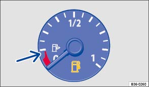 rote Markierung (Pfeil) | Kraftstoffbehälter fast leer. Reservemenge wird verbraucht → Füllmengen . |