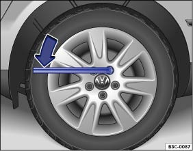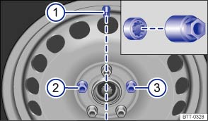 Die Anti-Diebstahl-Radschraube muss bei einem Rad mit Radvollblende an Position → Abb. 281 ② oder → Abb. 281 ③ , bezogen auf die Lage des Reifenventils → Abb. 281 ① , eingeschraubt sein. Die Radvollblende kann sonst nicht montiert werden.