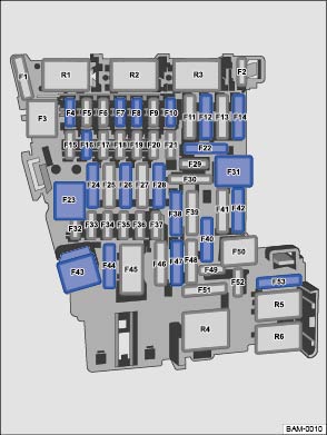 Je nach Ausführung und Ausstattung des Fahrzeugs kann es zu Abweichungen gegenüber der in der Tabelle aufgeführten Sicherungsnummern und Steckplätzen kommen. Gegebenenfalls die genaue Sicherungsbelegung bei einem Volkswagen Partner erfragen.