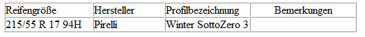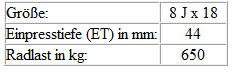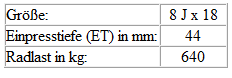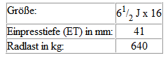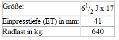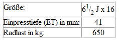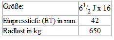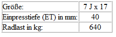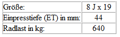 technisch möglichen Rad- und Reifenkombinationen in Abhängigkeit der
