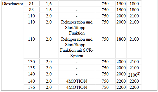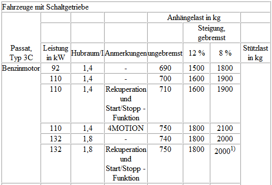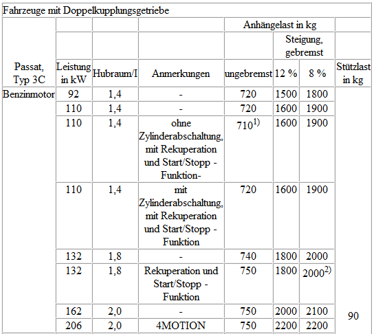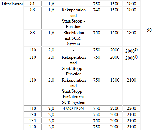 1) gilt für Fahrzeuge mit Batterie im Motorraum, bei Fahrzeugen mit Batterie im Kofferraum ist diese Anhängelast um 100 kg höher