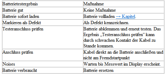 Alle Unterkapitel, Anmerkungen und Verweise zum zu prüfenden Fahrzeug, Batterietyp usw. sind zu beachten und einzuhalten.