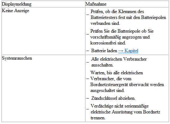 Die Prüfung von Batterien in VW - Fahrzeugen darf nur mit von VW zugelassenen Batterietestern durchgeführt werden. USA/ Kanada darf der Batterietester Midtronics -MCR340V- verwendet werden.