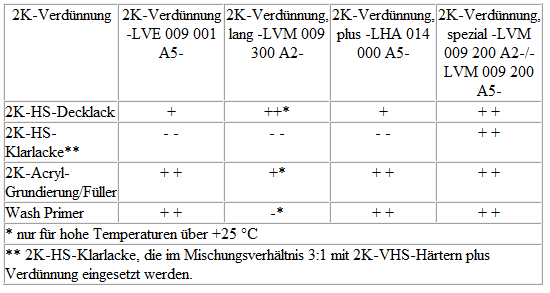 Diese Tabelle stellt eine allgemein gültige Übersicht der Einsatzmöglichkeiten der aufgeführten Verdünnungen dar. Darüber hinausgehende Angaben in der anwendungstechnischen Information der jeweiligen Stammkomponente sind bevorzugt zu berücksichtigen.